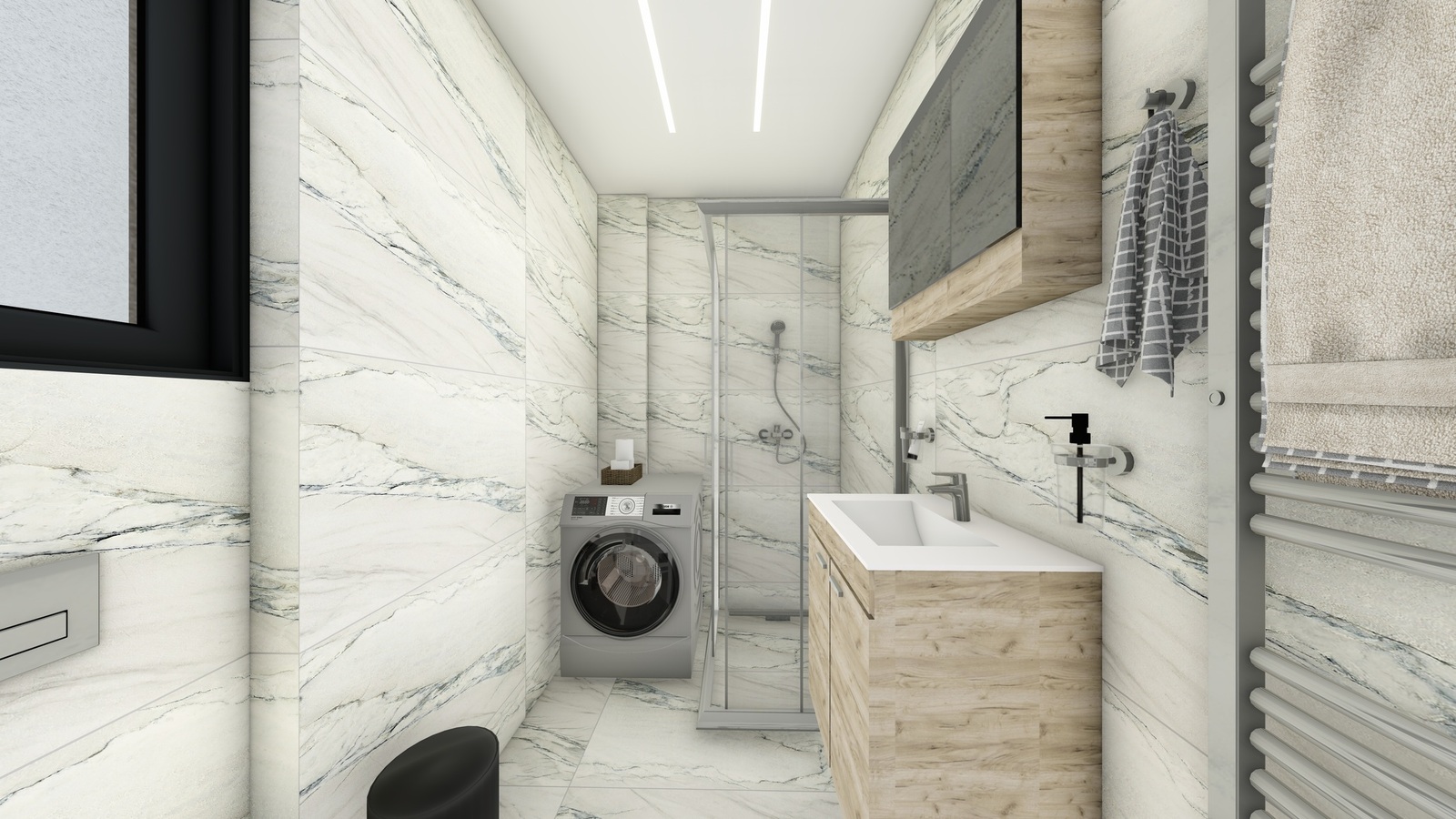 ντουζιέρες με γραμμικό σιφώνι, καμπίνες με κρύσταλλο σφαλείας, θερμαντικό διακοσμητικό σώμα, αξεσουάρ μπάνιου.